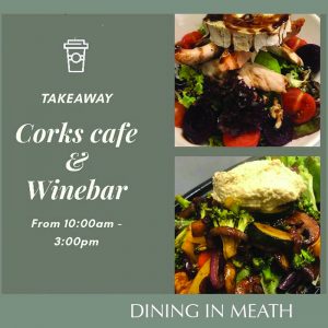 Corks Cafe & Winebar in Ashbourne are open from 10am – 3pm daily, serving breakfast, lunch and Sunday brunch for takeaway. Our menu is on the website http://www.corks.ie or on Instagram @corksashbourne.
