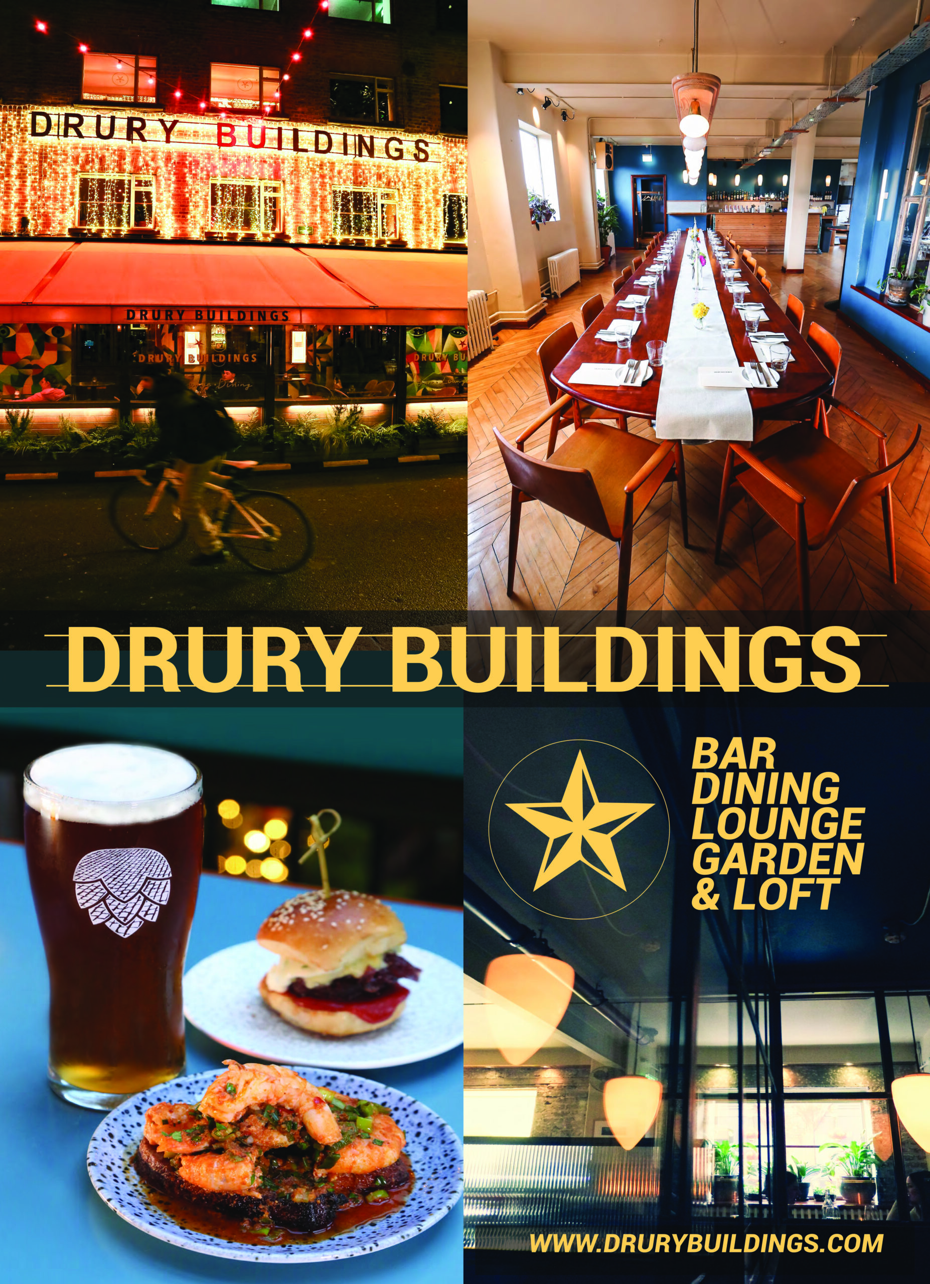 Drury Buildings is an owner operated award winning Bar, Restaurant & Event Venue in the heart of Dublin city centre. Serving a thoughtfully curated selection of Handcrafted Cocktails, Craft Beers & Fine Wine. Our food menu is designed with sharing in mind. We serve Large & Small dishes sourced from the very best suppliers & producers in Ireland cooked in our charcoal oven by our Head Chef Warren Massey.